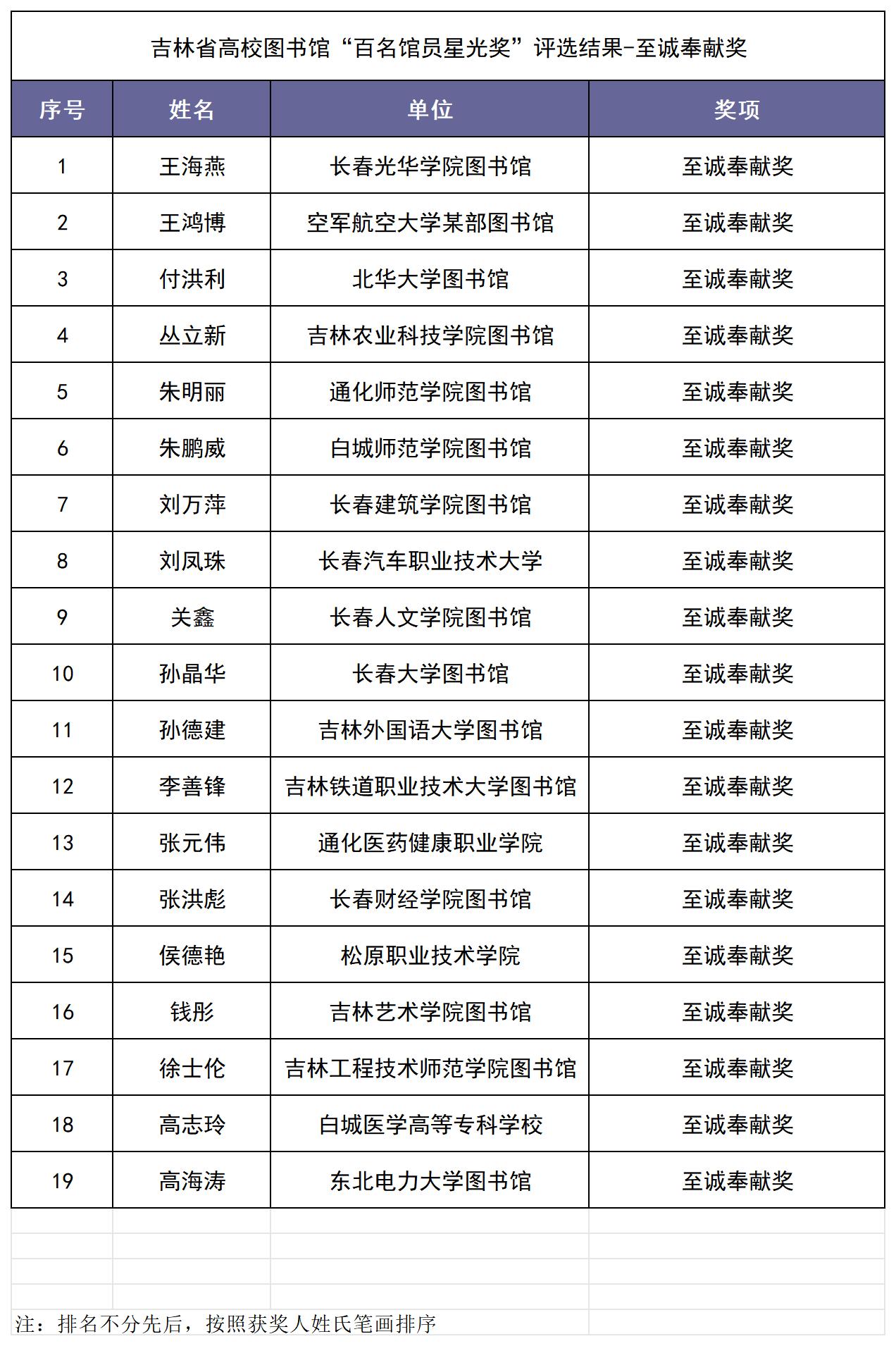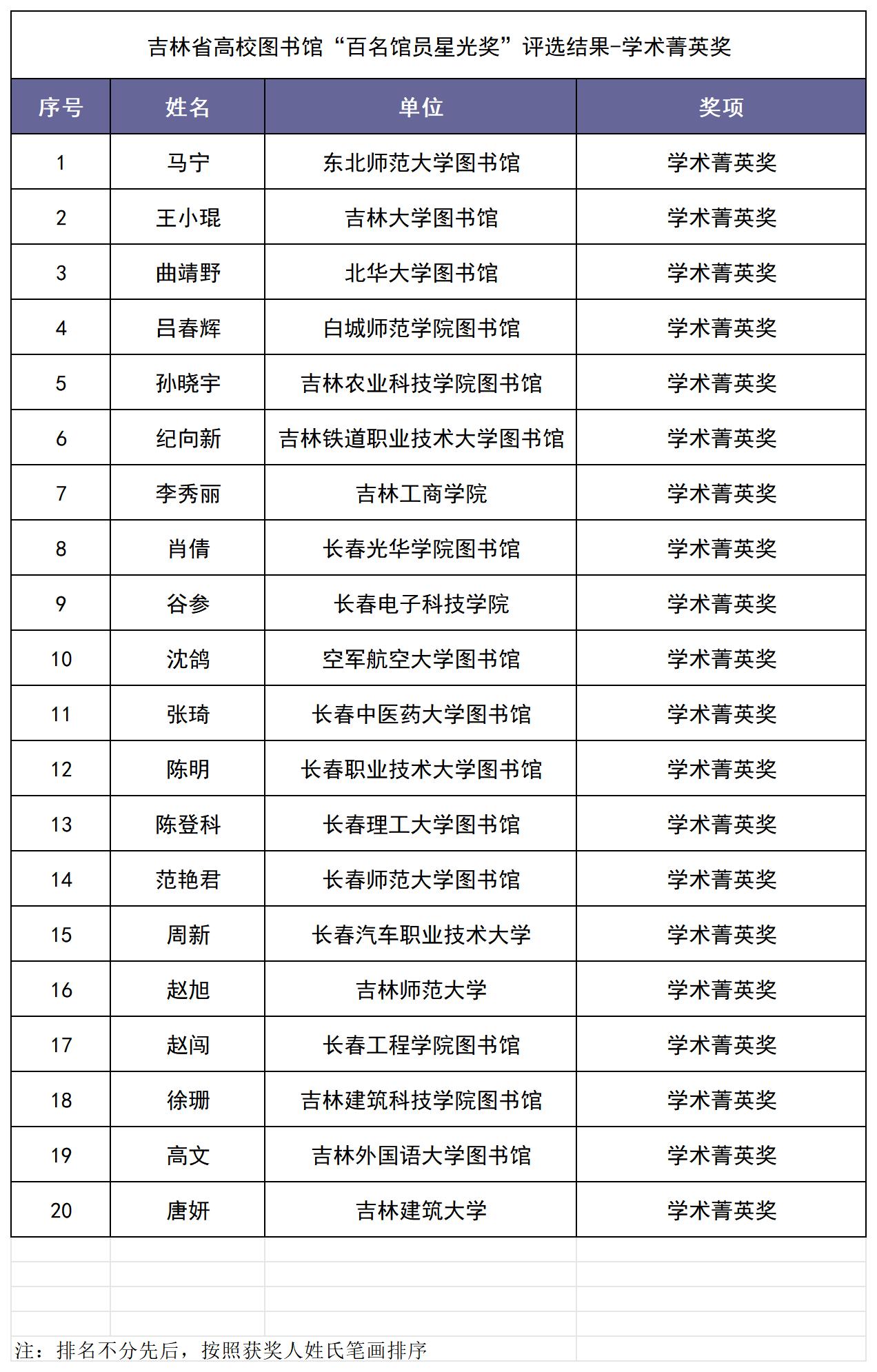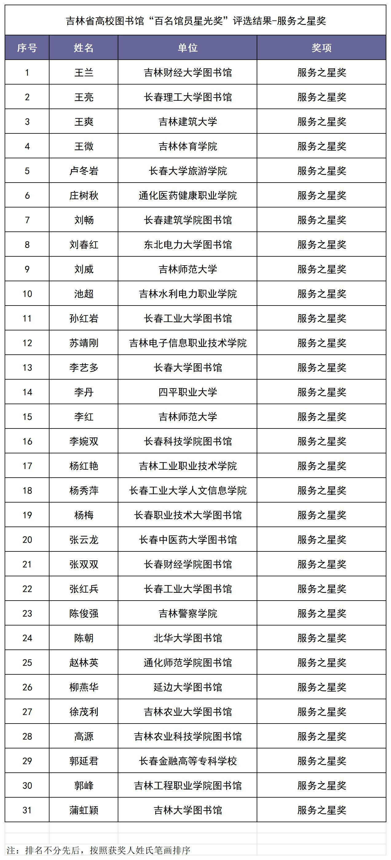 为深入贯彻党的二十届四中全会精神和习近平总书记在全国教育大会上的重要讲话精神,切实推进吉林省高校图书馆事业高质量发展,提升馆员队伍的职业荣誉感和使命感,充分展现新时代高校图书馆员的专业素养与精神风貌,吉林省高等学校图书情报工作委员会(以下简称“图工委”)落实立德树人根本任务,紧密结合高校发展实际,于近期组织开展了2025年度吉林省高校图书馆“百名馆员星光奖”评选活动。经专家评审,各项评选结果已经产生。根据活动要求,现将拟获奖名单进行公示。
