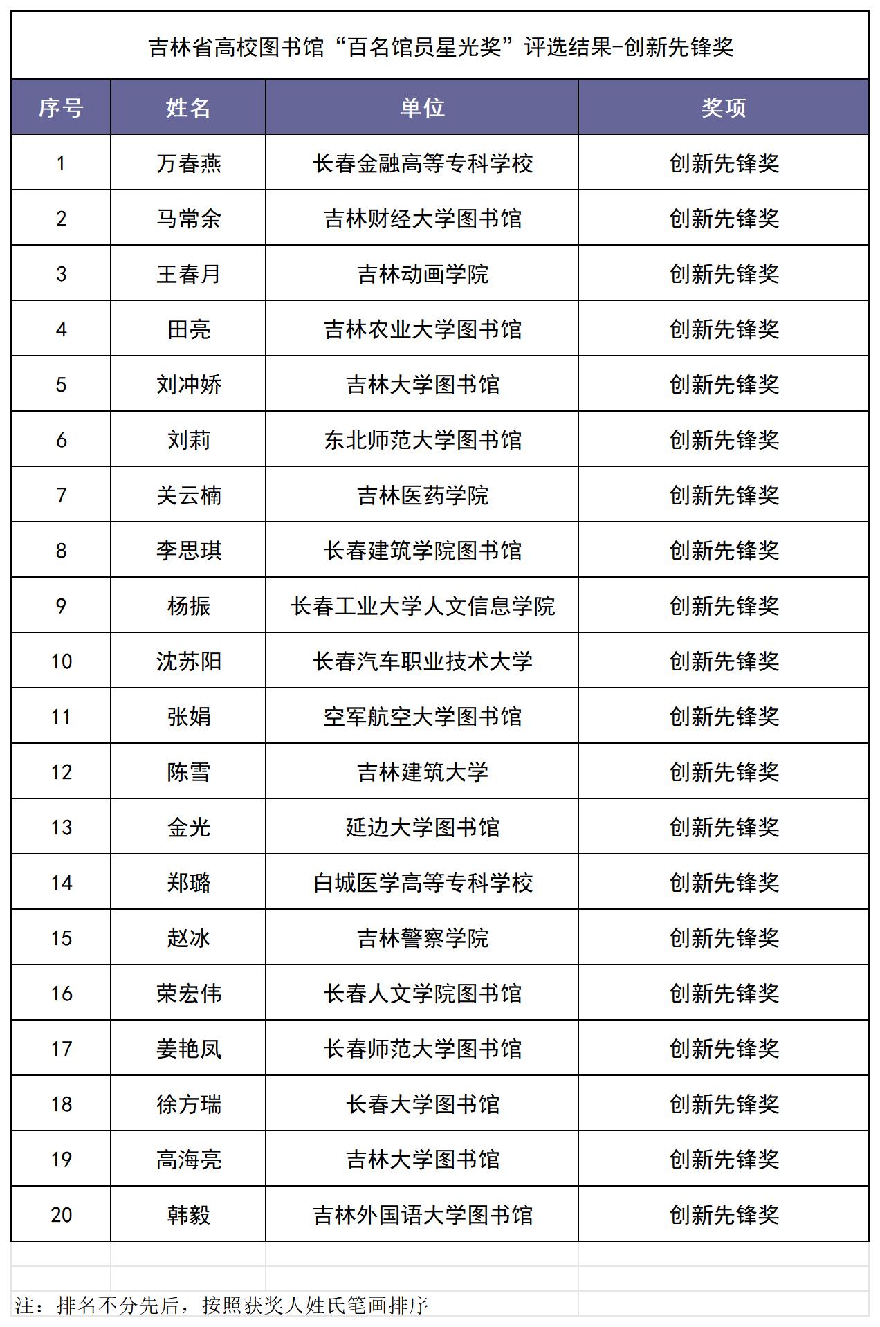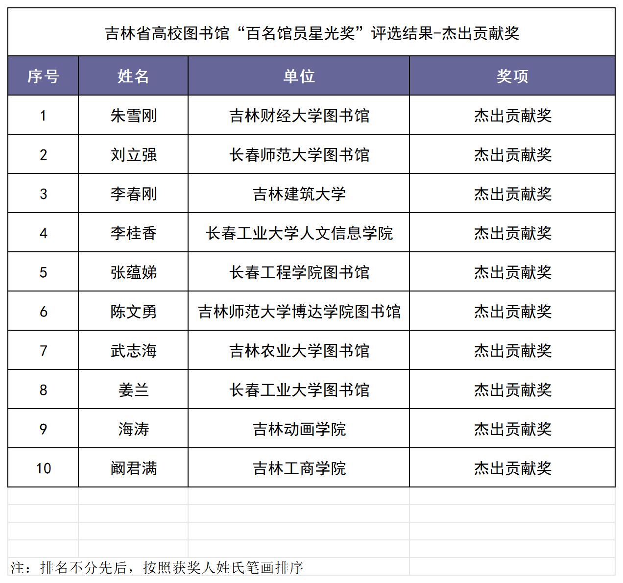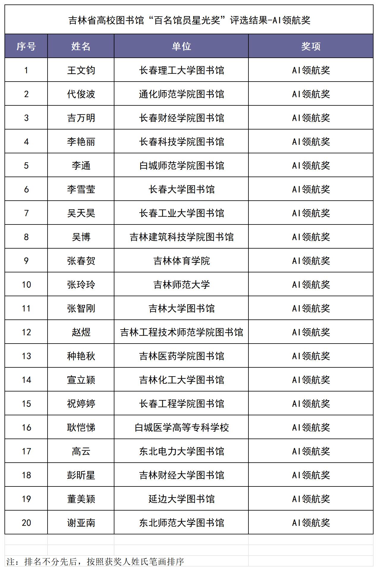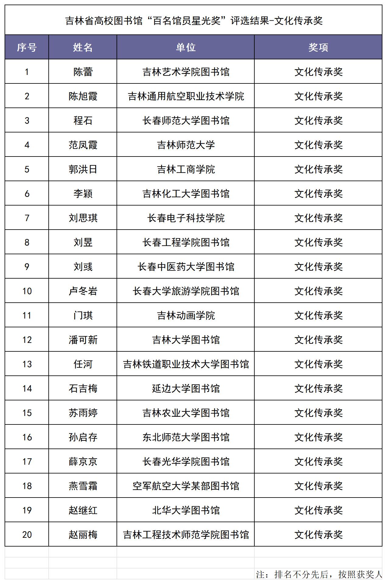 为深入贯彻党的二十届四中全会精神和习近平总书记在全国教育大会上的重要讲话精神,切实推进吉林省高校图书馆事业高质量发展,提升馆员队伍的职业荣誉感和使命感,充分展现新时代高校图书馆员的专业素养与精神风貌,吉林省高等学校图书情报工作委员会(以下简称“图工委”)落实立德树人根本任务,紧密结合高校发展实际,于近期组织开展了2025年度吉林省高校图书馆“百名馆员星光奖”评选活动。经专家评审,各项评选结果已经产生。根据活动要求,现将拟获奖名单进行公示。