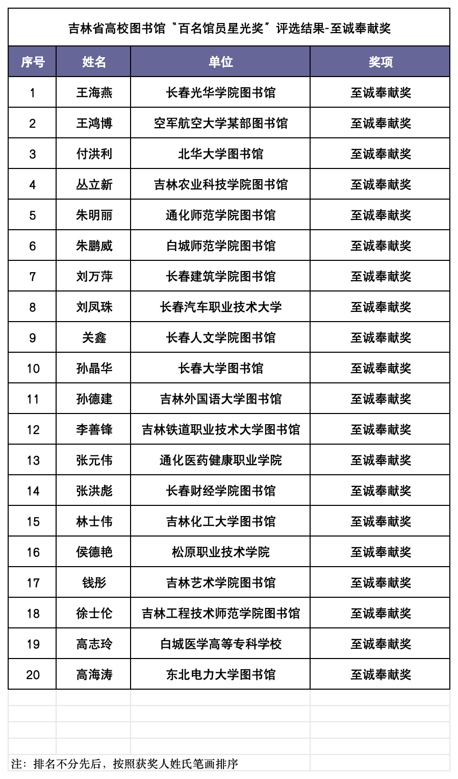为深入贯彻党的二十届四中全会精神和习近平总书记在全国教育大会上的重要讲话精神,切实推进吉林省高校图书馆事业高质量发展,提升馆员队伍的职业荣誉感和使命感,充分展现新时代高校图书馆员的专业素养与精神风貌,吉林省高等学校图书情报工作委员会(以下简称“图工委”)落实立德树人根本任务,紧密结合高校发展实际,于近期组织开展了2025年度吉林省高校图书馆“百名馆员星光奖”评选活动。经专家评审,各项评选结果已经产生,经三天公示期满,现将获奖名单正式公示如下:
