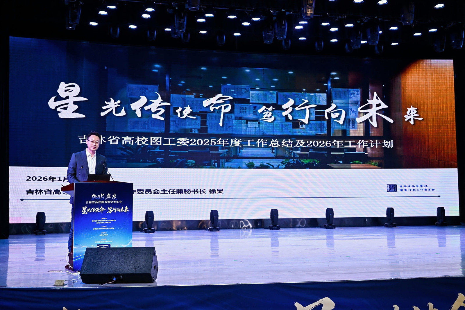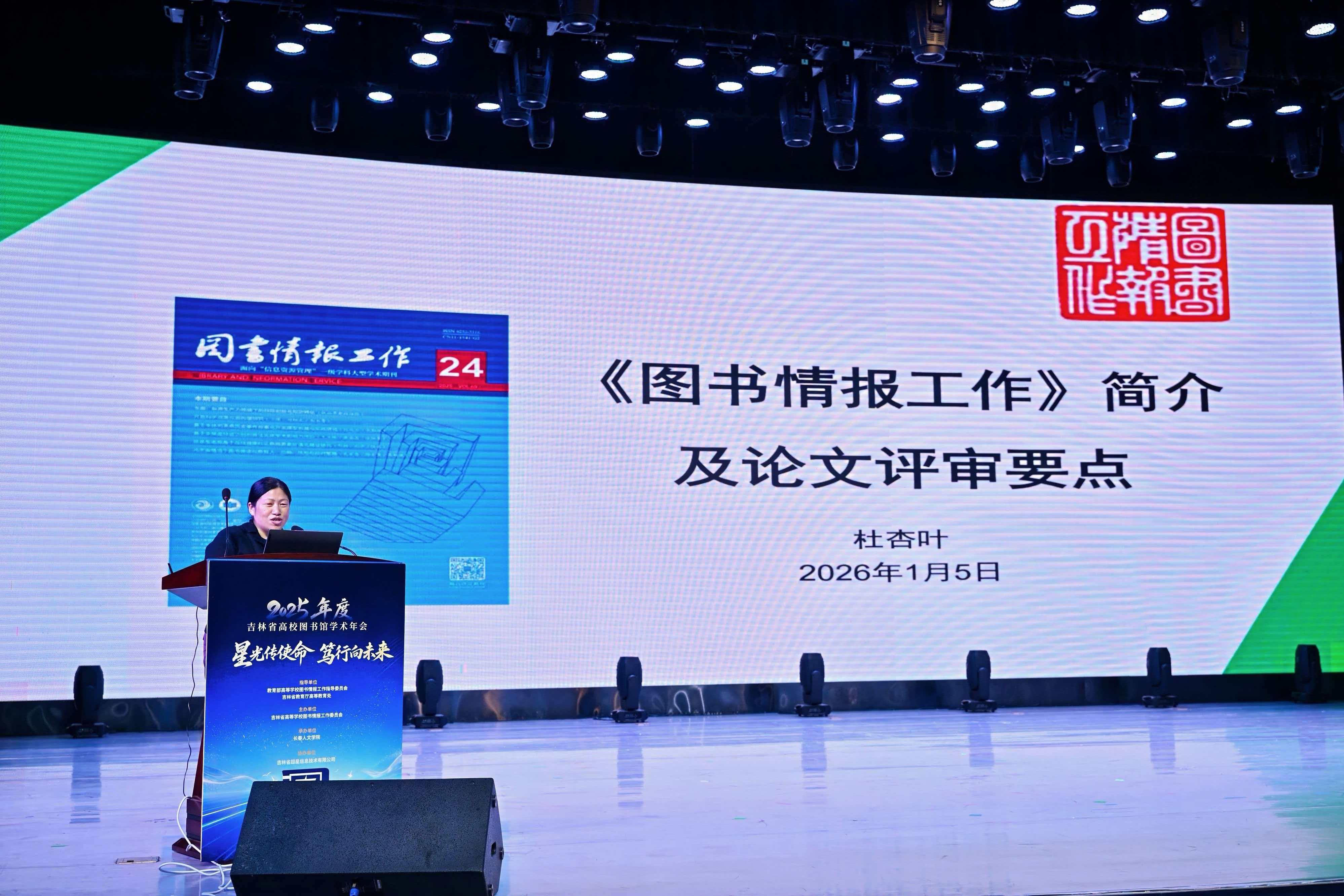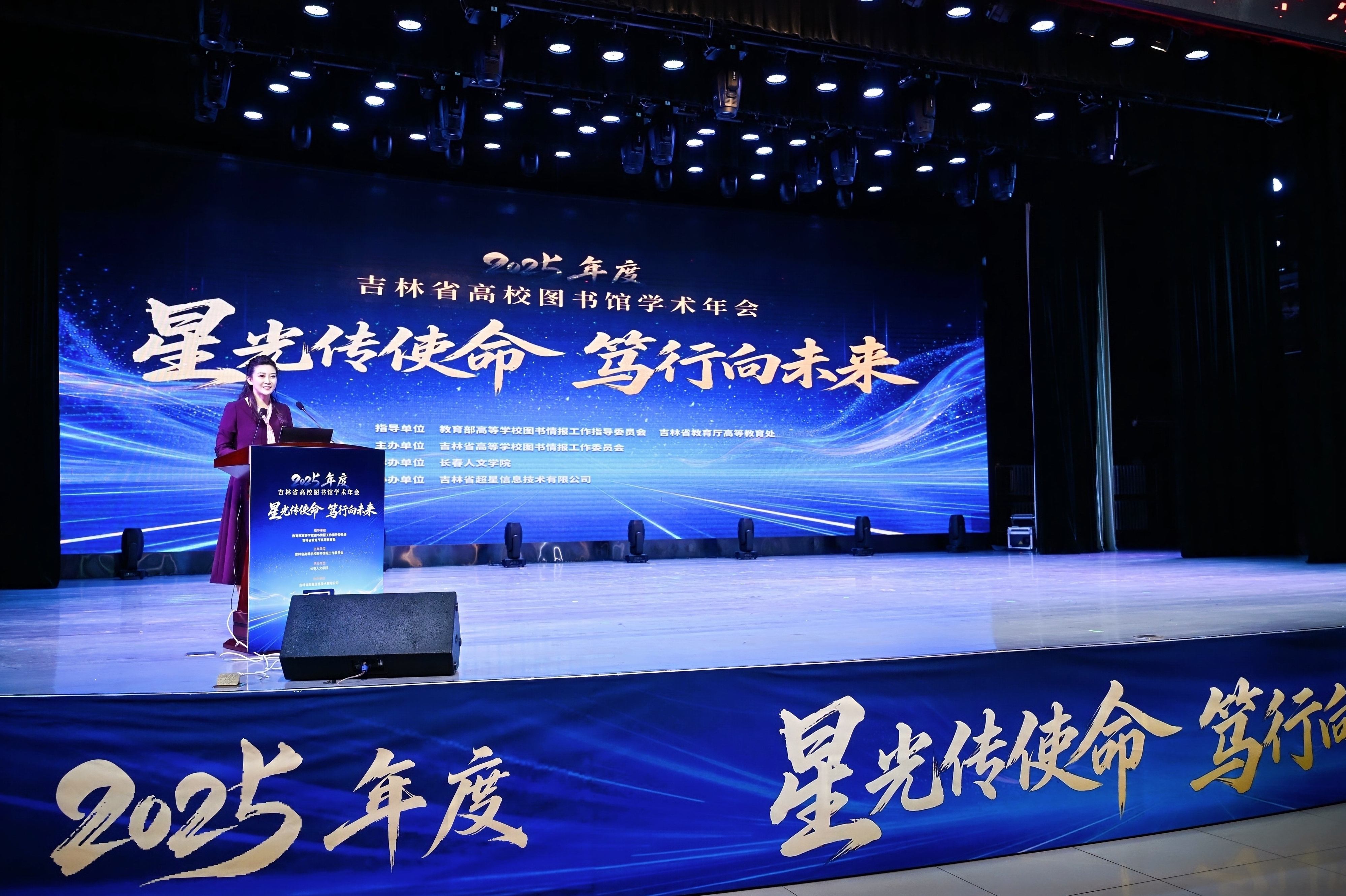 2026年1月5日,由吉林省高等学校图书情报工作委员会主办、长春人文学院承办、吉林省超星信息技术有限公司协办的“2025年度吉林省高校图书馆学术年会”在长春人文学院隆重举行。本次年会以“星光传使命,笃行向未来”为主题,来自全省60余所高校的图书馆馆长、业务骨干及特邀嘉宾等300余人参会,聚焦“十五五”时期高校图书馆的责任与使命,围绕AI赋能、智慧服务、资源共建共享等热点议题展开深入交流。