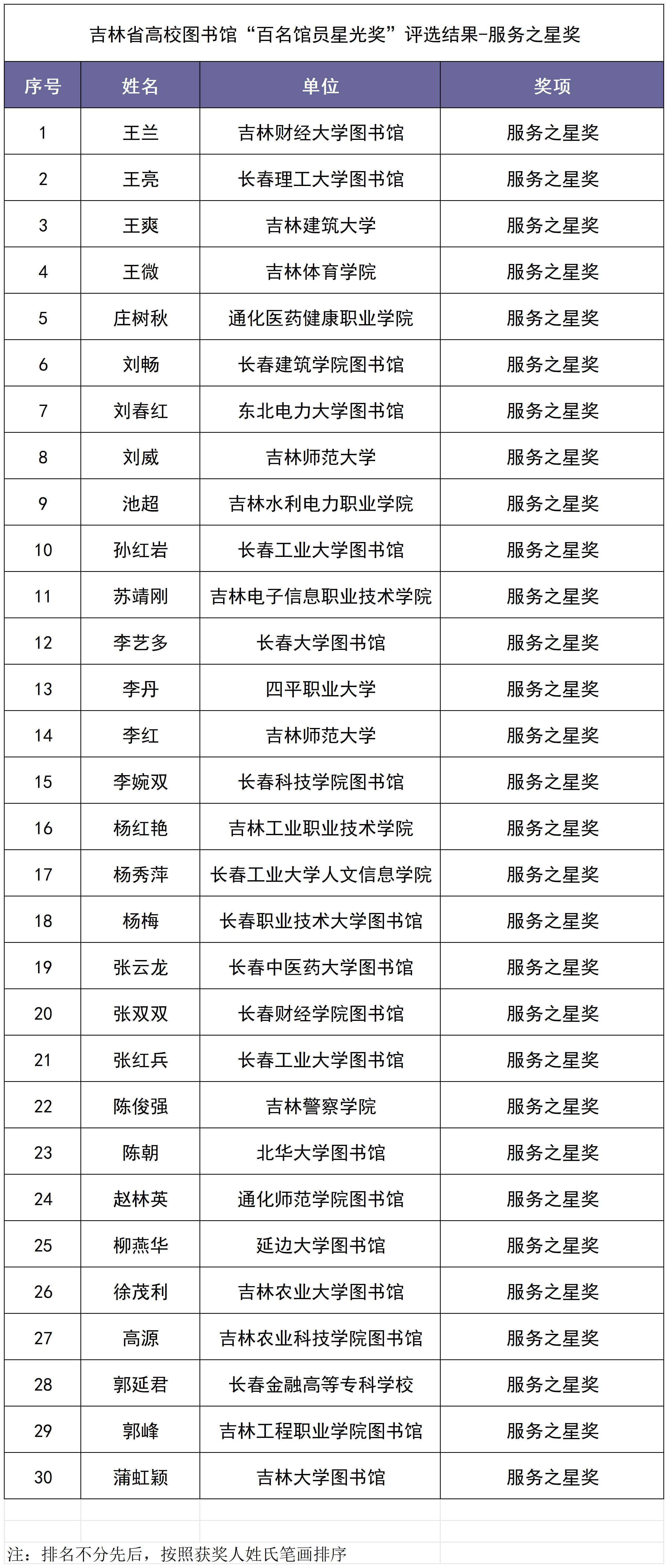 为深入贯彻党的二十届四中全会精神和习近平总书记在全国教育大会上的重要讲话精神,切实推进吉林省高校图书馆事业高质量发展,提升馆员队伍的职业荣誉感和使命感,充分展现新时代高校图书馆员的专业素养与精神风貌,吉林省高等学校图书情报工作委员会(以下简称“图工委”)落实立德树人根本任务,紧密结合高校发展实际,于近期组织开展了2025年度吉林省高校图书馆“百名馆员星光奖”评选活动。经专家评审,各项评选结果已经产生。根据活动要求,现将拟获奖名单进行公示。